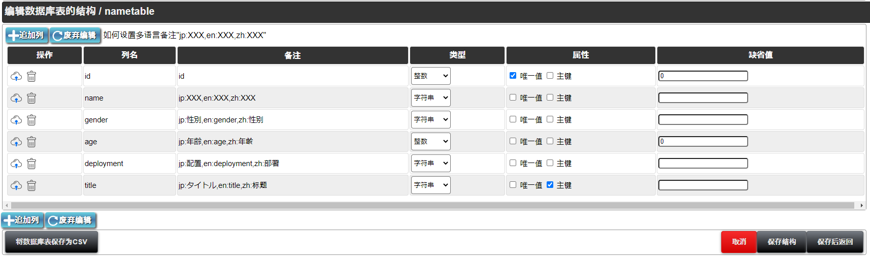 在编辑的过程中,不会在实际的数据库表中增加列。只有在保存设定后,数据库中才会增加或修改列。