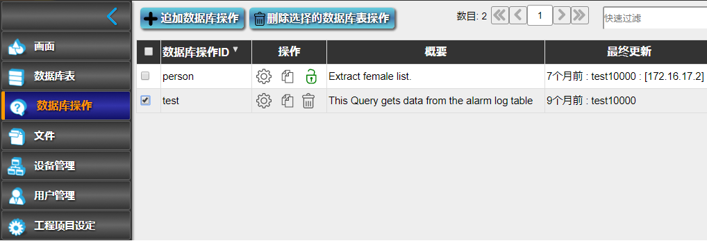在此画面上,显示了已经设定的数据库操作一览。