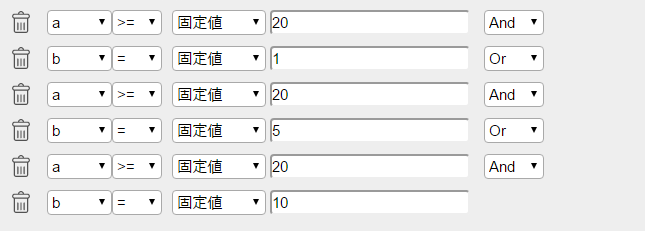 条件语句:a >= '20' and b = '1' or a >= '20' and b = '5' or a >= '20' and b = '10'