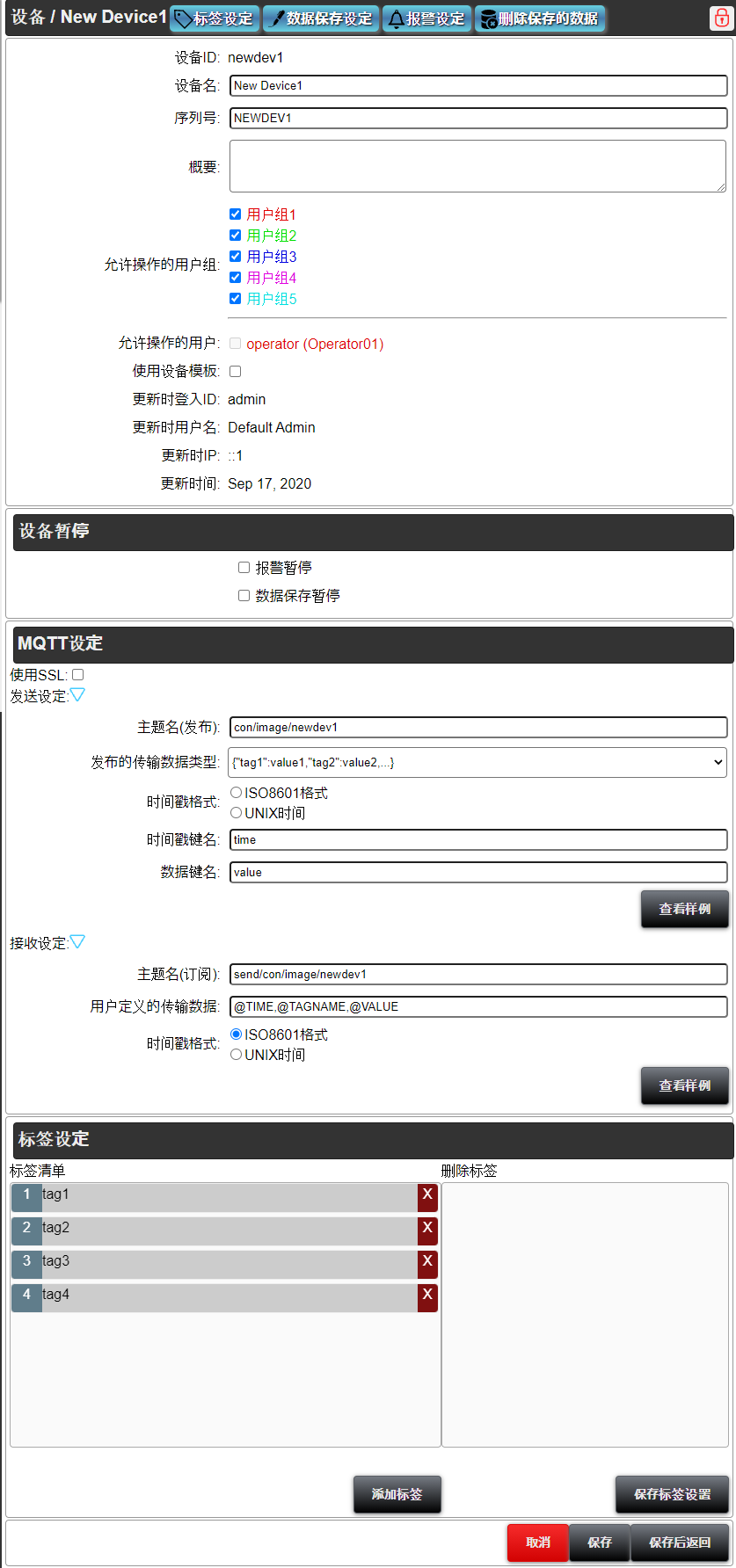标签设定 :进行对设备数据赋予标签名、备注等的设定。