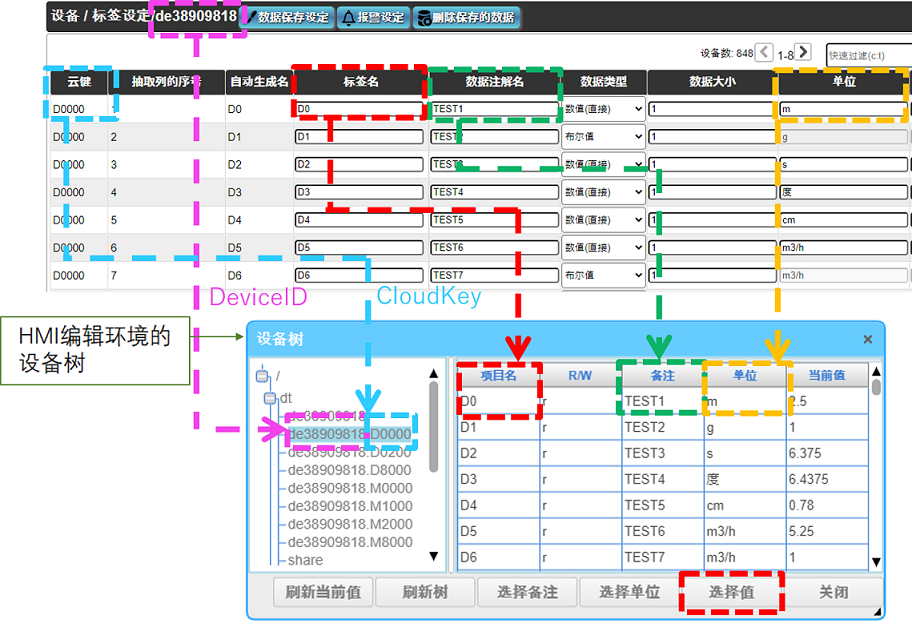 云服务器上设定数据标签及数据项目名,在在设备树中的显示如下图。