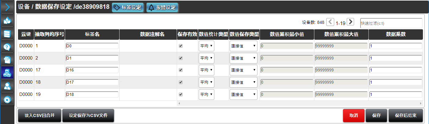 如果打勾,表示需要保存数据;从设备接收到的数据将按直接数据、分钟、小时、天、月的单位分别保存在不同的数据库表格内。数据保存的期限,可以在数据保存期限中设定。