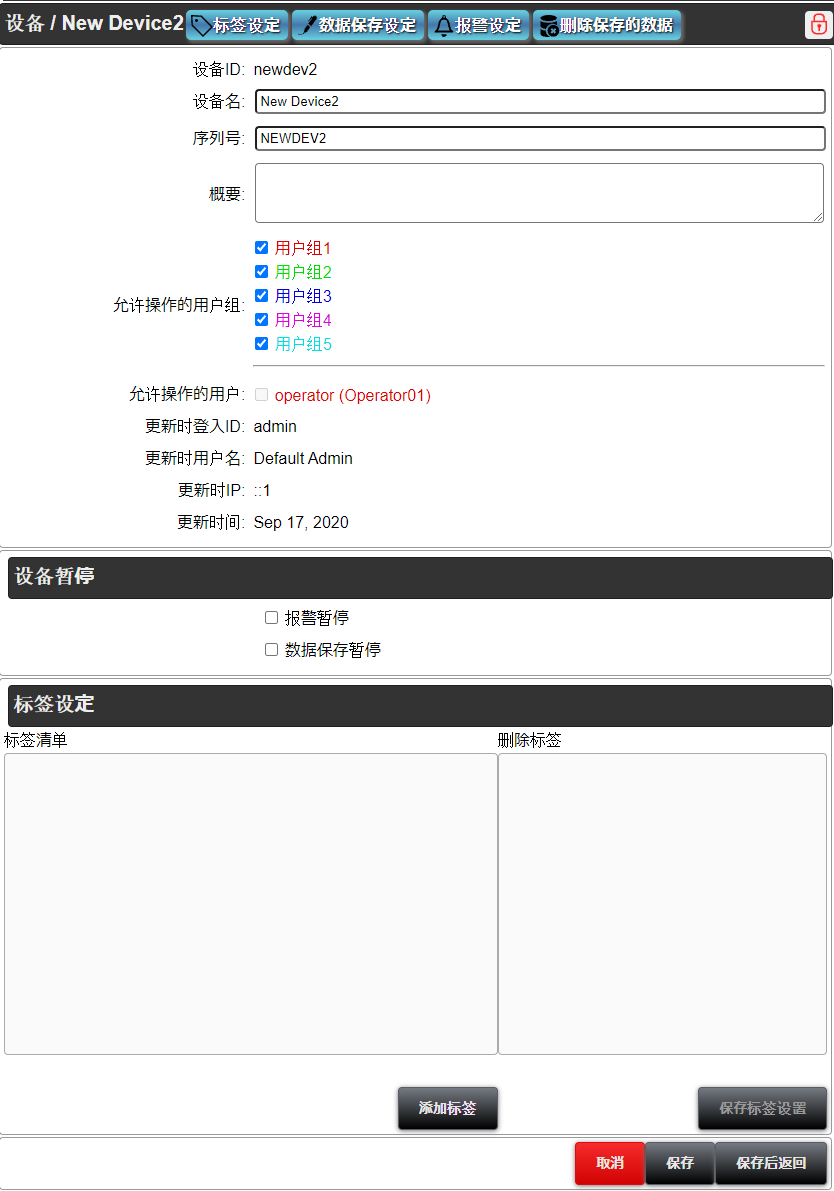 标签设定 :进行对设备数据赋予标签名、备注等的设定。