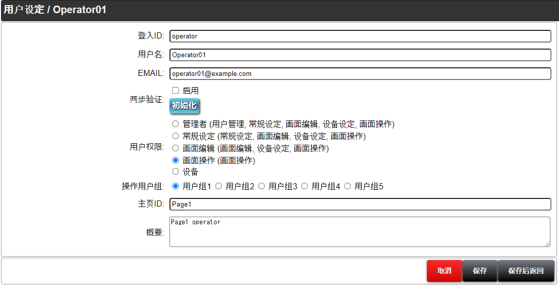 如用户登入ID是“admin”,不能更改ID。登入ID最多40个字符。
