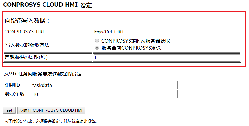 | CONPROSYS设备的URL地址 | 指定可以从云服务器访问此设备的URL。 如果是出厂设置,应该是“http://10.1.1.101”。 此设定用于从云服务器直接向此CONPROSYS设备发送数据。 |
