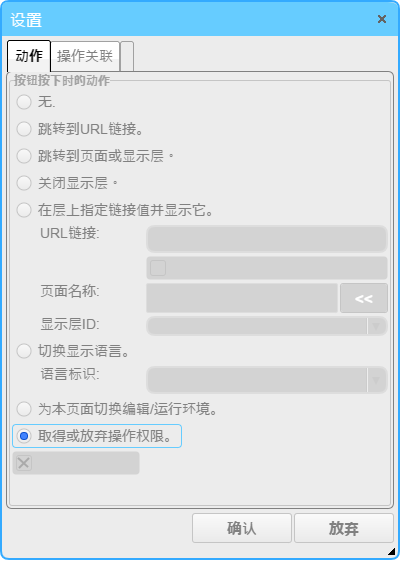 在按钮部件的详细设定对话框的“动作”设定页的动作选项中,选择“取得或放弃操作权”。