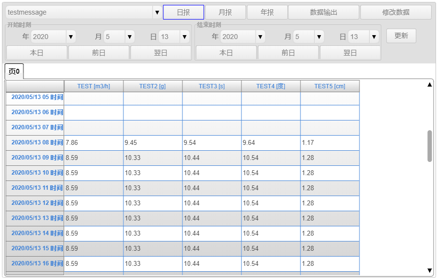 在报表数据显示区域中,显示从开始日期和时间设置区域中设置的日期和时间开始的一个月的值。您可以通过在此报表数据显示区域中选择报报表元格来输入数据。