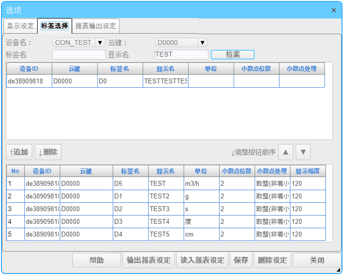 在选择的标签名列表中,列出了选择的标签名,标签备注,显示名称,单位,小数位数,小数点处理和显示宽度。